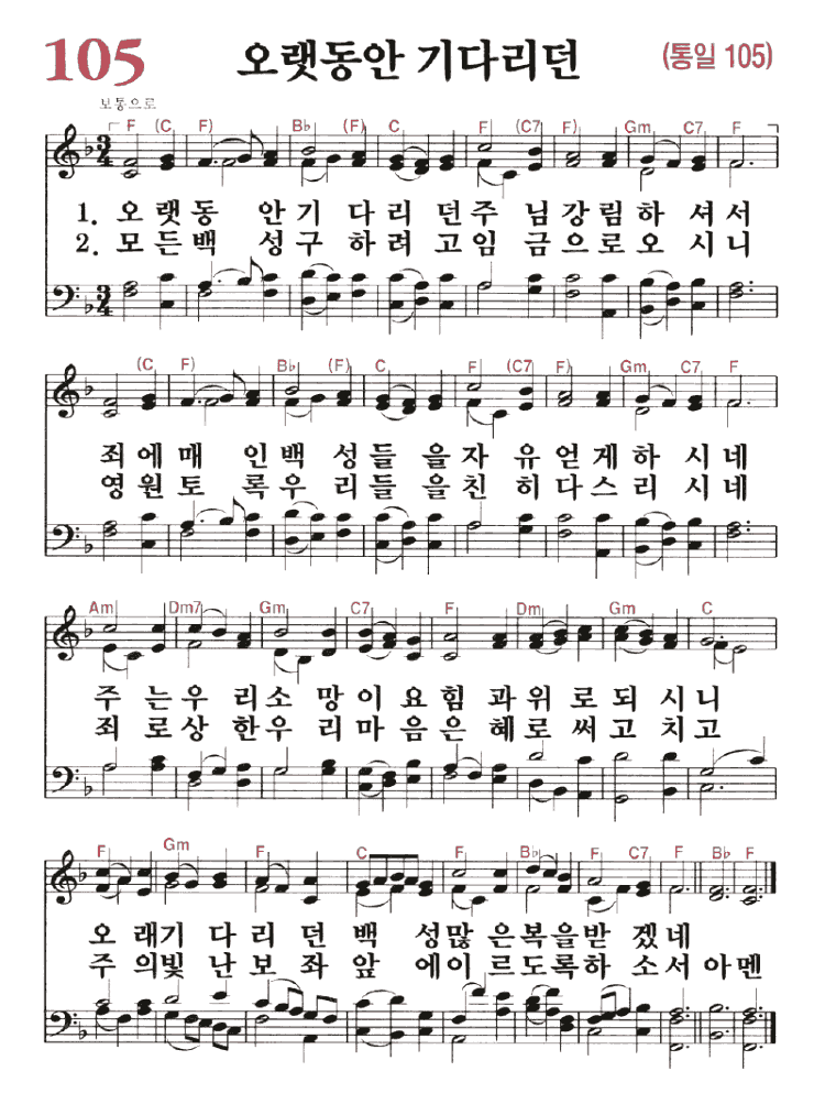 (1)오랫동안 기다리던 주님 강림하셔서 죄에 매인 백성들을 자유 얻게 하시네 주는 우리 소망이요 힘과 위로 되시니 오래 기다리던 백성 많은 복을 받겠네 (2)모든 백성 구하려고 임금으로 오시니 영원토록 우리들을 친히 다스리시네 죄로 상한 우리 마음 은혜로써 고치고 주의 빛난 보좌 앞에 이르도록 하소서 아멘