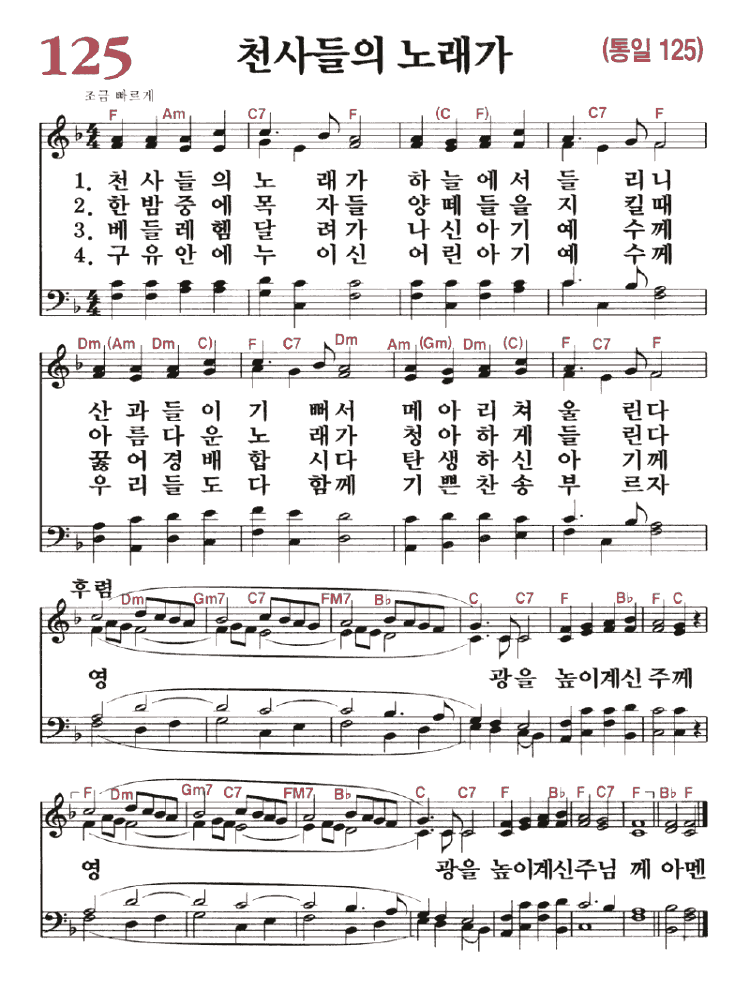 (1)천사들의 노래가 하늘에서 들리니 산과 들이 기뻐서 메아리쳐 울린다 후렴 : 영광을 높이 계신 주께 영광을 높이계신 주님께 아멘 (2)한밤중에 목자들 양떼들을 지킬 때 아름다운 노래가 청아하게 들린다 (3)베들레헴 달려가 나신 아기 예수께 꿇어 경배 합시다 탄생하신 아기께 (4)구유 안에 누이신 어린 아기 예수께 우리들도 다 함께 기쁜 찬송 부르자