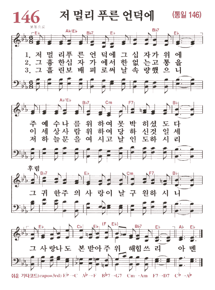 (1)저 멀리 푸른 언덕에 그 십자가 위에 주 예수 나를 위하여 못 박히셨도다 후렴 : 그 귀한 주의 사랑이 날 구원하시니 그 사랑 나도 본받아 주 위해 힘쓰리 아멘 (2)그 흉한 십자가에서 한 없는 고통을 이 세상 사람 위하여 당하신 것 일세 (3)그 흘린 보배 피로써 날 속량 했으니 저 하늘문을 여시고 날 인도하시리