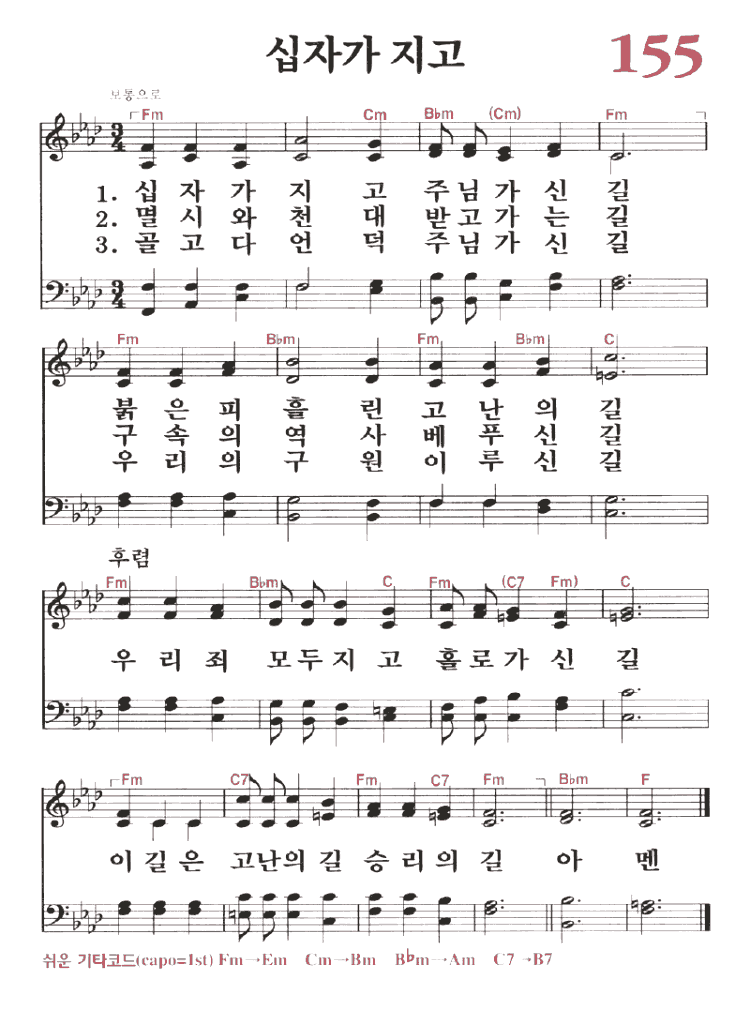 (1)십자가 지고 주님 가신 길 붉은 피 흘린 고난의 길 후렴 : 우리 죄 모두 지고 홀로 가신 길 이 길은 고난의 길 승리의 길 아멘 (2)멸시와 천대 받고 가는 길 구속의 역사 베푸신 길 (3)골고다 언덕 주님 가신 길 우리의 구원 이루신 길