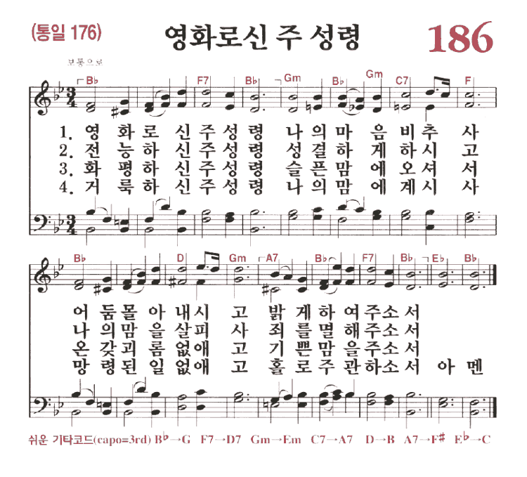 (1)영화로신 주 성령 나의 마음 비추사 어둠 몰아내시고 밝게 하여 주소서 (2)전능하신 주 성령 성결하게 하시고 나의 맘을 살피사 죄를 멸해 주소서 (3)화평하신 주 성령 슬픈 맘에 오셔서 온갖 괴롬 없애고 기쁜 맘을 주소서 (4)거룩하신 주 성령 나의 맘에 계시사 망령된 일 없애고 홀로 주관 하소서 아멘