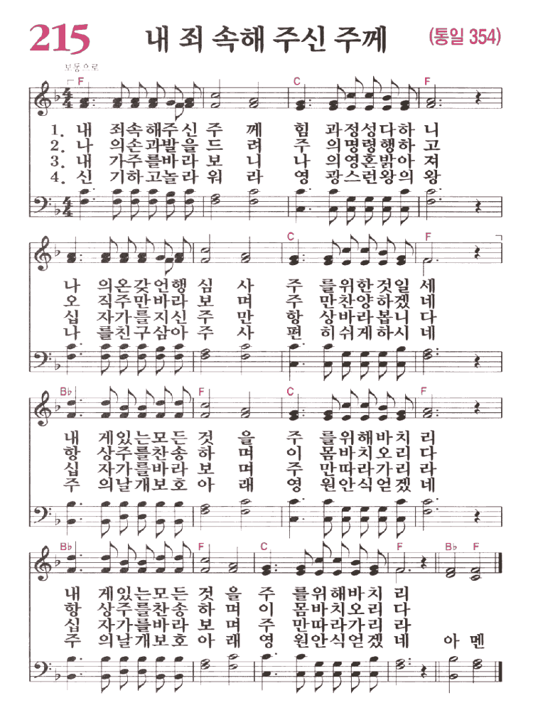 (1)내 죄 속해 주신 주께 힘과 정성 다하니 나의 온갖 언행심사 주를 위한 것일세 내게 있는 모든 것을 주를 위해 바치리 내게 있는 모든 것을 주를 위해 바치리 (2)나의 손과 발을 드려 주의 명령 행하고 오직 주만 바라보며 주만 찬양 하겠네 항상 주를 찬송하며 이 몸 바치오리다 항상 주를 찬송하며 이 몸 바치오리다 (3)내가 주를 바라보니 나의 영혼 밝아져 십자가를 지신 주만 항상 바라 봅니다 십자가를 바라보며 주만 따라가리라 십자가를 바라보며 주만 따라가리라 (4)신기하고 놀라워라 영광스런 왕의 왕 나를 친구 삼아주사 편히 쉬게 하시네 주의 날개 보호 아래 영원 안식 얻겠네 주의 날개 보호 아래 영원 안식 얻겠네 아멘