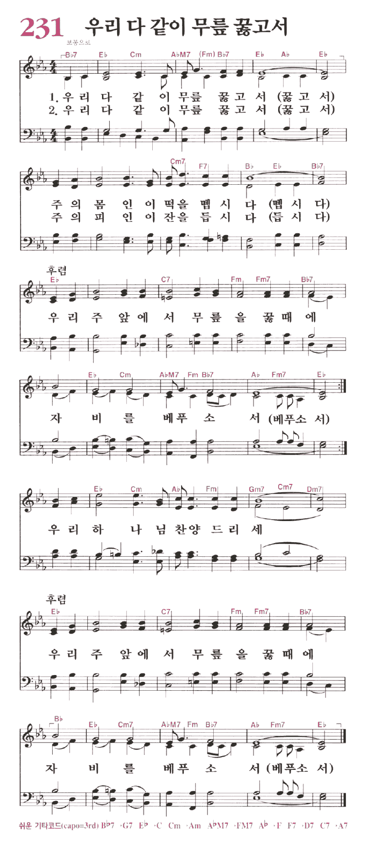 (1)우리 다 같이 무릎 꿇고서(꿇고서) 주의 몸인 이 떡을 뗍시다(뗍시다) 우리 주 앞에서 무릎을 꿇을 때에 자비를 베푸소서(베푸소서) (2)우리 다 같이 무릎 꿇고서(꿇고서) 주의 피인 이 잔을 듭시다(듭시다) 우리 주 앞에서 무릎을 꿇을 때에 자비를 베푸소서(베푸소서) (3)우리 다 같이 무릎 꿇고서(꿇고서) 우리 하나님 찬양 드리세 우리 주 앞에서 무릎을 꿇을 때에 자비를 베푸소서(베푸소서)