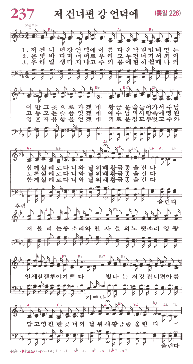 (1)저 건너편 강 언덕에 아름다운 낙원 있네 믿는 이만 그 곳으로 가겠네 황금 문을 들어가서 주님 함께 살리로다 너와 날 위해 황금 종 울린다 저 울리는 종소리와 천사들의 노랫소리 영광일세 할렐루야 기쁘다 빛나는 저 강 건너편 아름답고 영원한 곳 너와 날 위해 황금 종 울린다 (2)은빛바다 저 너머로 우리 모두 건너가서 죄와 고통 모든 슬픔 잊겠네 예수님의 사랑 속에 영원토록 살리로다 너와 날 위해 황금 종 울린다 저 울리는 종소리와 천사들의 노랫소리 영광일세 할렐루야 기쁘다 빛나는 저 강 건너편 아름답고 영원한 곳 너와 날 위해 황금 종 울린다 (3)우리 일생 다 지나고 주의 품에 편히 쉴 때 나의 영혼 자유함을 얻겠네 괴로운 짐 모두 벗고 주와 함께 살리로다 너와 날 위해 황금 종 울린다 저 울리는 종소리와 천사들의 노랫소리 영광일세 할렐루야 기쁘다 빛나는 저 강 건너편 아름답고 영원한 곳 너와 날 위해 황금 종 울린다