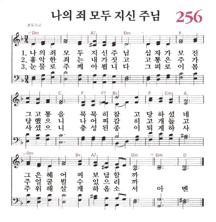 (1)나의 죄 모두 지신 주님 십자가 모진 그 고통을 묵묵히 참고 당하셨네 그 은혜 어찌 보답할까 (2)흉악한 죄는 내가 짓고 고통은 주가 당했으니 나 어찌 감히 고개 들고 주 얼굴 뵐 수 있으리까 (3)눈물로 주께 아룁니다 그 피로 이 몸 사셨으니 충성된 종이 되게 하사 주 위해 살게 하옵소서 아멘