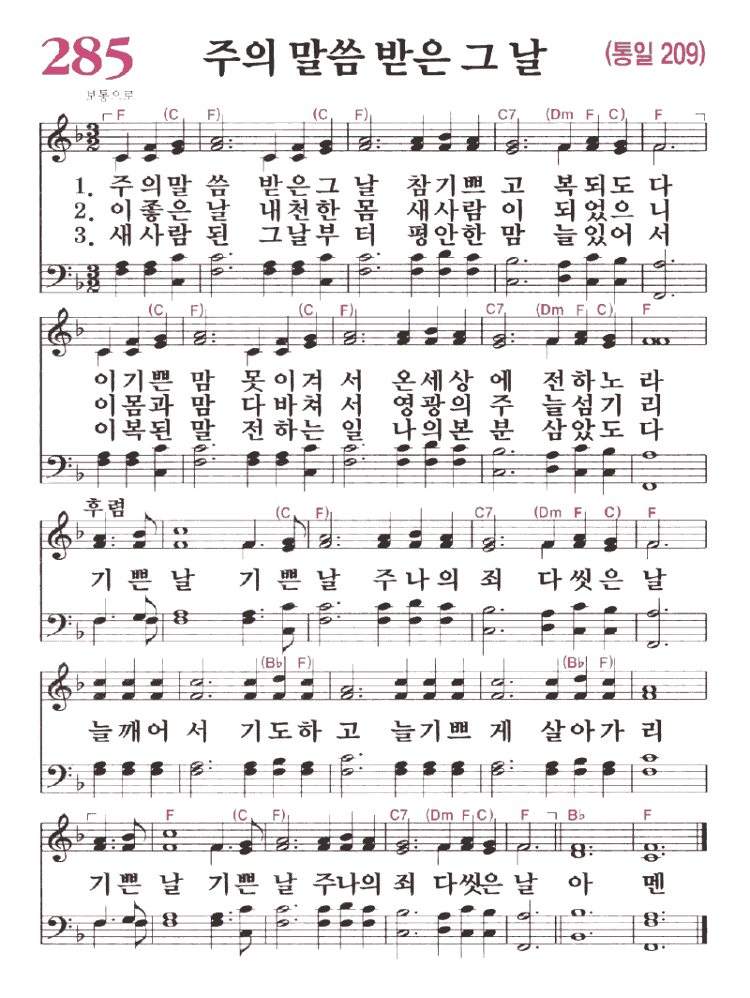 (1)주의 말씀 받은 그 날 참 기쁘고 복 되도다 이 기쁜 맘 못 이겨서 온 세상에 전하노라 기쁜 날 기쁜 날 주 나의 죄 다 씻은 날 늘 깨어서 기도하고 늘 기쁘게 살아가리 기쁜 날 기쁜 날 주 나의 죄 다 씻은 날 (2)이 좋은 날 내 천한 몸 새 사람이 되었으니 이 몸과 맘 다 바쳐서 영광의 주 늘 섬기리 기쁜 날 기쁜 날 주 나의 죄 다 씻은 날 늘 깨어서 기도하고 늘 기쁘게 살아가리 기쁜 날 기쁜 날 주 나의 죄 다 씻은 날 (3)새 사람 된 그 날부터 평안한 맘 늘 있어서 이 복된 말 전하는 일 나의 본분 삼았도다 기쁜 날 기쁜 날 주 나의 죄 다 씻은 날 늘 깨어서 기도하고 늘 기쁘게 살아가리 기쁜 날 기쁜 날 주 나의 죄 다 씻은 날 아멘