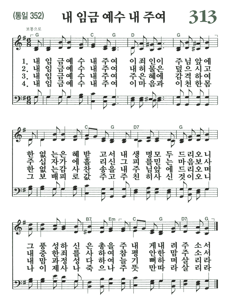 (1)내 임금 예수 내 주여 이 죄인이 주님 앞에 한없는 은혜 받고서 내 생명 모두 드리오니 그 풍성하신 은총을 주 내게 내려 주소서 (2)내 임금 예수 내 주여 내 허물은 덮으시고 주 십자가에 흘리신 그 피를 믿는 마음 보사 내 중한 죄를 사하여 참 평안한 맘 주소서 (3)내 임금 예수 내 주여 주 은혜에 감격하여 한없는 감사 찬송을 내 주님 앞에 드리오며 내 맘과 정성 다하여 늘 기뻐하며 살리라 (4)내 임금 예수 내 주여 이 마음과 이 천한 몸 그 보배피로 값 주고 주 친히 사신 것이오니 나 이제 사나 죽으나 주 뜻만 따라 살리라