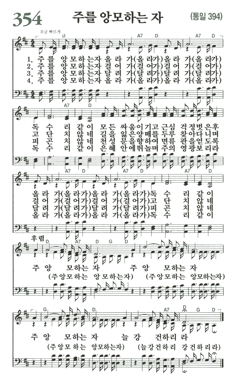 (1)주를 앙모 하는 자 올라가 올라가 독수리 같이 모든 싸움 이기고 근심 걱정 벗은 후 올라가 올라가 독수리 같이 주 앙모 하는 자 주 앙모 하는 자 주 앙모 하는 자 늘 강건 하리라 (2)주를 앙모 하는 자 걸어가 걸어가 고단치 않네 길을 잃은 양떼를 두루 찾아 다니며 걸어가 걸어가 고단치 않네 주 앙모 하는 자 주 앙모 하는 자 주 앙모 하는 자 늘 강건 하리라 (3)주를 앙모 하는 자 달려가 달려가 피곤치 않네 천성 문을 향하여 면류관을 얻도록 달려가 달려가 피곤치 않네 주 앙모 하는 자 주 앙모 하는 자 주 앙모 하는 자 늘 강건 하리라 (4)주를 앙모하는 자 올라가 올라가 독수리 같이 은혜 안에 뛰놀며 주의 영광 보리라 올라가 올라가 독수리 같이 주 앙모 하는 자 주 앙모 하는 자 주 앙모 하는 자 늘 강건 하리라