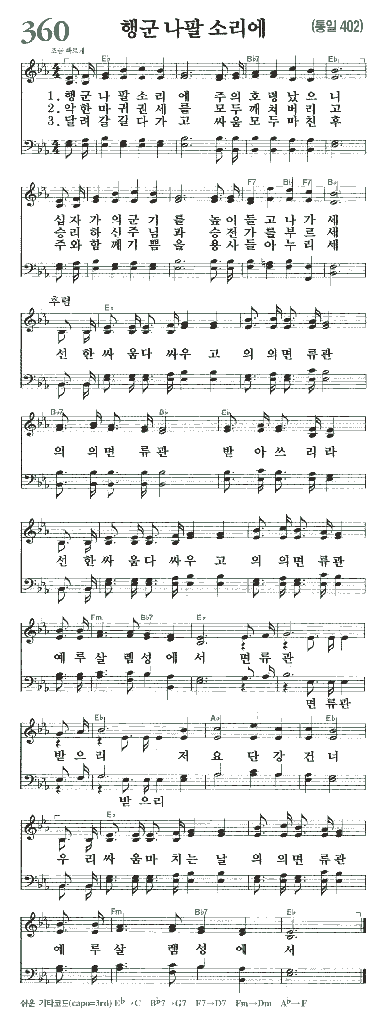 (1)행군 나팔 소리에 주의 호령 났으니 십자가의 군기를 높이 들고 나가세 선한 싸움 다 싸우고 의의 면류관 의의 면류관 받아 쓰리라 선한 싸움 다 싸우고 의의 면류관 예루살렘 성에서 면류관 받으리 저 요단강 건너 우리 싸움 마치는 날 의의 면류관 예루살렘 성에서 (2)악한 마귀 권세를 모두 깨쳐 버리고 승리 하신 주님과 승전가를 부르세 선한 싸움 다 싸우고 의의 면류관 의의 면류관 받아 쓰리라 선한 싸움 다 싸우고 의의 면류관 예루살렘 성에서 면류관 받으리 저 요단강 건너 우리 싸움 마치는 날 의의 면류관 예루살렘 성에서 (3)달려 갈 길 다 가고 싸움 모두 마친 후 주와 함께 기쁨을 용사들아 누리세 선한 싸움 다 싸우고 의의 면류관 의의 면류관 받아 쓰리라 선한 싸움 다 싸우고 의의 면류관 예루살렘 성에서 면류관 받으리 저 요단강 건너 우리 싸움 마치는 날 의의 면류관 예루살렘 성에서