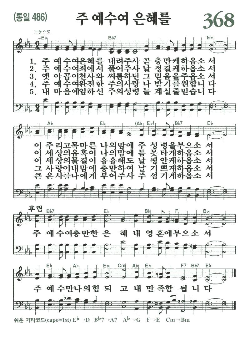 (1)주 예수여 은혜를 내려 주사 곧 충만케 하옵소서 이 주리고 목마른 나의 맘에 주 성령을 부으소서 주 예수여 충만한 은혜 내 영혼에 부으소서 주 예수만 나의 힘 되고 내 만족함 됩니다 (2)주 예수여 죄에서 풀어주사 날 정결케 하옵소서 이 세상의 유혹이 나의 맘에 틈 못 타게 하옵소서 주 예수여 충만한 은혜 내 영혼에 부으소서 주 예수만 나의 힘 되고 내 만족함 됩니다 (3)옛 야곱이 천사와 씨름하던 그 믿음을 주옵소서 이 세상의 물결이 흉흉해도 날 평안케 하옵소서 주 예수여 충만한 은혜 내 영혼에 부으소서 주 예수만 나의 힘 되고 내 만족함 됩니다 (4)주 예수여 완전한 주의 사랑 나 받기를 원합니다 그 사랑이 내 맘에 충만하여 날 기쁘게 하옵소서 주 예수여 충만한 은혜 내 영혼에 부으소서 주 예수만 나의 힘 되고 내 만족함 됩니다 (5)내 마음에 임하신 주의 성령 늘 계실 줄 믿습니다 큰 은사를 나에게 부어주사 주 섬기게 하옵소서 주 예수여 충만한 은혜 내 영혼에 부으소서 주 예수만 나의 힘 되고 내 만족함 됩니다