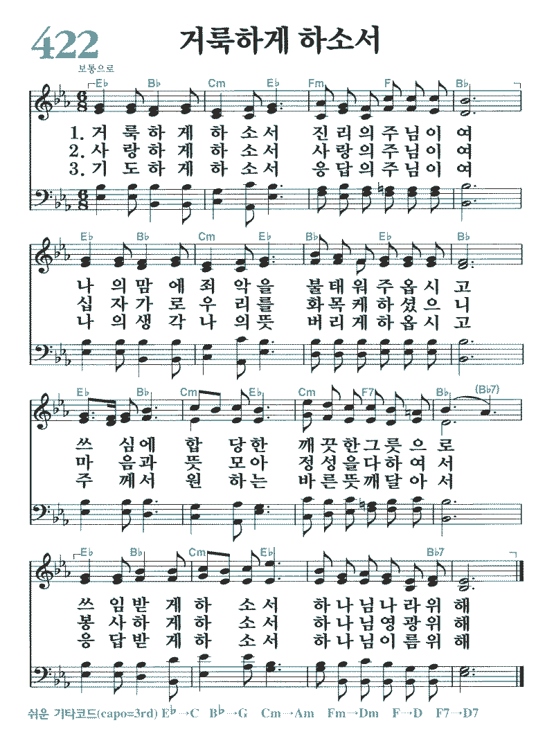 (1)거룩하게 하소서 진리의 주님이여 나의 맘에 죄악을 불태워 주옵시고 쓰심에 합당한 깨끗한 그릇으로 쓰임 받게 하소서 하나님나라 위해 (2)사랑하게 하소서 사랑의 주님이여 십자가로 우리를 화목케 하셨으니 마음과 뜻 모아 정성을 다하여서 봉사하게 하소서 하나님 영광 위해 (3)기도하게 하소서 응답의 주님이여 나의 생각 나의 뜻 버리게 하옵시고 주께서 원하는 바른 뜻 깨달아서 응답받게 하소서 하나님 이름 위해