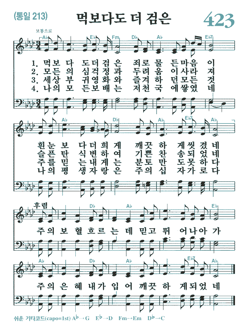 (1)먹보다도 더 검은 죄로 물든 마음이 흰 눈 보다 더 희게 깨끗하게 씻겼네 주의 보혈 흐르는데 믿고 뛰어 나아가 주의 은혜 내가 입어 깨끗하게 되었네 (2)모든 의심 걱정과 두려움이 사라져 슬픈 탄식 변하여 기쁜 찬송 되었네 주의 보혈 흐르는데 믿고 뛰어 나아가 주의 은혜 내가 입어 깨끗하게 되었네 (3)세상 부귀 영화와 즐겨하던 모든 것 주를 믿는 내게는 분토만도 못하다 주의 보혈 흐르는데 믿고 뛰어 나아가 주의 은혜 내가 입어 깨끗하게 되었네 (4)나의 모든 보배는 저 천국에 쌓였네 나의 평생 자랑은 주의 십자가로다 주의 보혈 흐르는데 믿고 뛰어 나아가 주의 은혜 내가 입어 깨끗하게 되었네