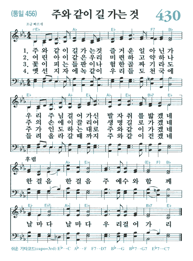 (1)주와 같이 길가는 것 즐거운 일 아닌가 우리 주님 걸어가신 발자취를 밟겠네 한 걸음 한 걸음 주 예수와 함께 날마다 날마다 우리 걸어가리 (2)어린 아이 같은 우리 미련하고 약하나 주의 손에 이끌리어 생명 길로 가겠네 한 걸음 한 걸음 주 예수와 함께 날마다 날마다 우리 걸어가리 (3)꽃이 피는 들판이나 험한 골짜기라도 주가 인도 하는 대로 주와 같이 가겠네 한 걸음 한 걸음 주 예수와 함께 날마다 날마다 우리 걸어가리 (4)옛 선지자 에녹같이 우리들도 천국에 들려 올라 갈 때 까지 주와 같이 걷겠네 한 걸음 한 걸음 주 예수와 함께 날마다 날마다 우리 걸어가리