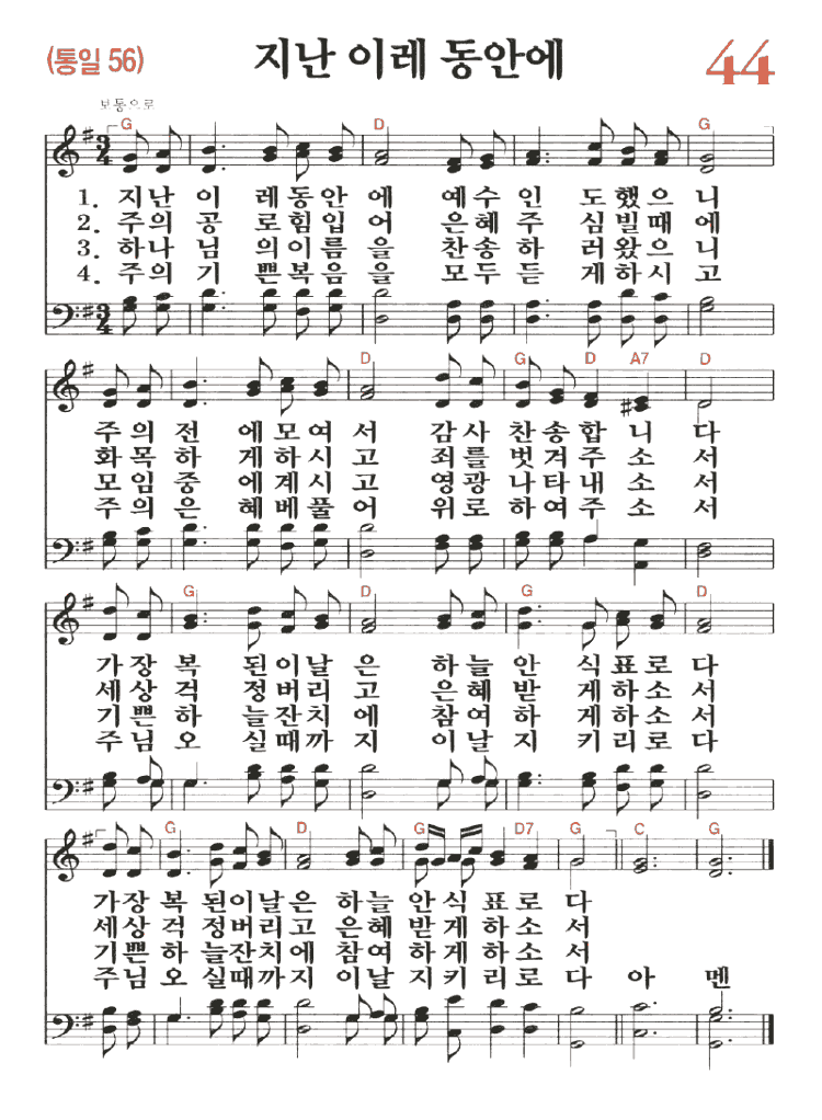 (1)지난 이레 동안에 예수 인도 했으니 주의 전에 모여서 감사 찬송 합니다 가장 복된 이 날은 하늘 안식표로다 가장 복된 이 날은 하늘 안식표로다 2)주의 공로 힘입어 은혜 주심 빌 때에 화목하게 하시고 죄를 벗겨 주소서 세상 걱정 버리고 은혜 받게 하소서 세상 걱정 버리고 은혜 받게 하소서 (3)하나님의 이름을 찬송하러 왔으니 모임 중에 계시고 영광 나타내소서 기쁜 하늘 잔치에 참여 하게 하소서 기쁜 하늘 잔치에 참여 하게 하소서 (4)주의 기쁜 복음을 모두 듣게 하시고 주의 은혜 베풀어 위로하여 주소서 주님 오실 때까지 이 날 지키리로다 주님 오실 때까지 이 날 지키리로다 아멘