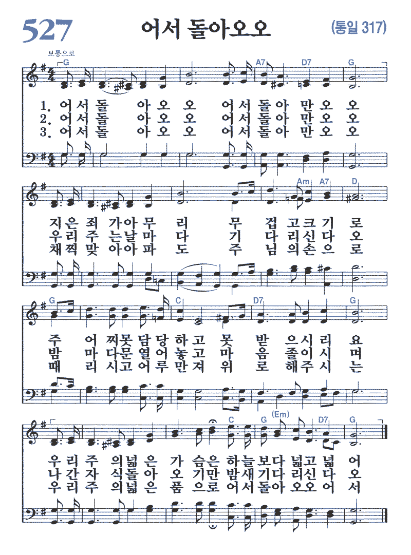 (1)어서 돌아오오 어서 돌아만 오오 지은 죄가 아무리 무겁고 크기로 주 어찌 못 담당하고 못 받으시리요 우리 주의 넓은 가슴은 하늘보다 넓고 넓어 (2)어서 돌아오오 어서 돌아만 오오 우리 주는 날마다 기다리신다오 밤마다 문 열어 놓고 마음 졸이시며 나간 자식 돌아오기만 밤새 기다리신다오 (3)어서 돌아오오 어서 돌아만 오오 채찍 맞아 아파도 주님의 손으로 때리시고 어루만져 위로 해 주시는 우리 주의 넓은 품으로 어서 돌아오오 어서
