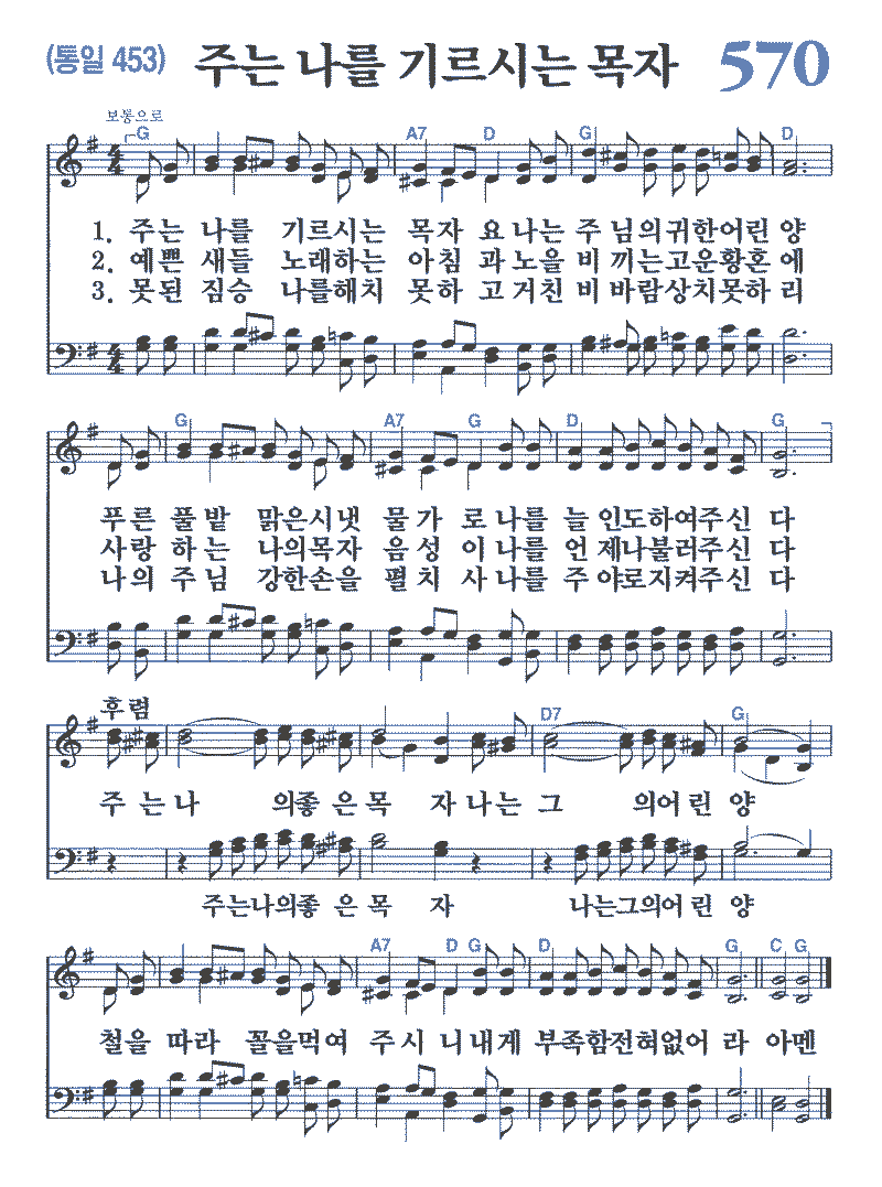 (1)주는 나를 기르시는 목자요 나는 주님의 귀한 어린양 푸른 풀밭 맑은 시냇 물가로 나를 늘 인도 하여 주신다 주는 나의 좋은 목자 나는 그의 어린양 철을 따라 꼴을 먹여 주시니 내게 부족함 전혀 없어라 (2)예쁜 새들 노래 하는 아침과 노을 비끼는 고운 황혼에 사랑하는 나의 목자 음성이 나를 언제나 불러주신다 주는 나의 좋은 목자 나는 그의 어린양 철을 따라 꼴을 먹여 주시니 내게 부족함 전혀 없어라 (3)못된 짐승 나를 해치 못하고 거친 비바람 상치 못하리 나의 주님 강한 손을 펼치사 나를 주야로 지켜주신다 주는 나의 좋은 목자 나는 그의 어린양 철을 따라 꼴을 먹여 주시니 내게 부족함 전혀 없어라 아멘