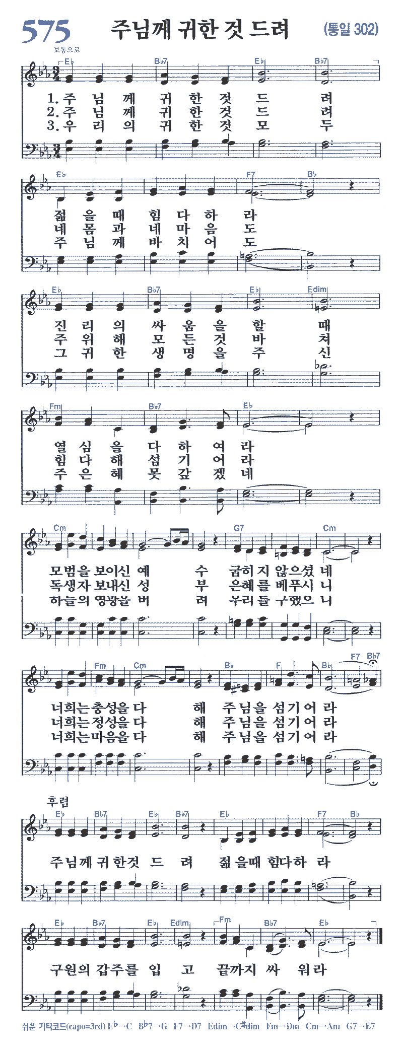 (1)주님께 귀한 것 드려 젊을 때 힘 다하라 진리의 싸움을 할 때 열심을 다하여라 모범을 보이신 예수 굽히지 않으셨네 너희는 충성을 다해 주님을 섬기어라 주님께 귀한 것 드려 젊을 때 힘 다하라 구원을 갑주를 입고 끝까지 싸워라 (2)주님께 귀한 것 드려 네 몸과 네 마음도 주 위해 모든 것 바쳐 힘 다해 섬기어라 독생자 보내신 성부 은혜를 베푸시니 너희는 정성을 다해 주님을 섬기어라 주님께 귀한 것 드려 젊을 때 힘 다하라 구원을 갑주를 입고 끝까지 싸워라 (3)우리의 귀한 것 모두 주님께 바치어도 그 귀한 생명을 주신 주 은혜 못 갚겠네 하늘의 영광을 버려 우리를 구했으니 너희는 마음을 다해 주님을 섬기어라 주님께 귀한 것 드려 젊을 때 힘 다하라 구원을 갑주를 입고 끝까지 싸워라