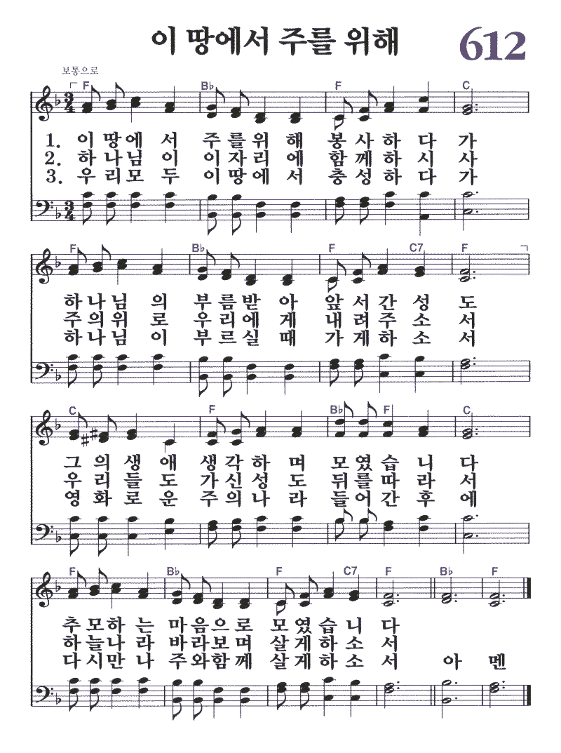 (1)이 땅에서 주를 위해 봉사하다가 하나님의 부름 받아 앞서간 성도 그의 생애 생각하며 모였습니다 추모하는 마음으로 모였습니다 (2)하나님이 이 자리에 함께 하시사 주의 위로 우리에게 내려주소서 우리들도 가신 성도 뒤를 따라서 하늘나라 바라보며 살게 하소서 (3)우리 모두 이 땅에서 충성하다가 하나님이 부르실 때 가게 하소서 영화로운 주의 나라 들어간 후에 다시 만나 주와 함께 살게 하소서 아멘