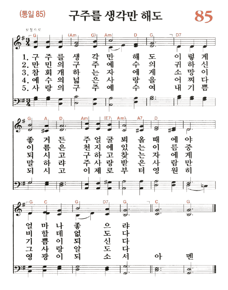 (1)구주를 생각만 해도 이렇게 좋거든 주 얼굴 뵈올 때에야 얼마나 좋으랴 (2)만민의 구주 예수의 귀하신 이름은 천지에 있는 이름 중 비할 데 없도다 (3)참 회개 하는 자에게 소망이 되시고 구하고 찾는 자에게 기쁨이 되신다 (4)예수의 넓은 사랑을 어찌 다 말하랴 주 사랑 받은 사람만 그 사랑 알도다 (5)사랑의 구주 예수여 내 기쁨 되시고 이제로부터 영원히 영광이 되소서 아멘